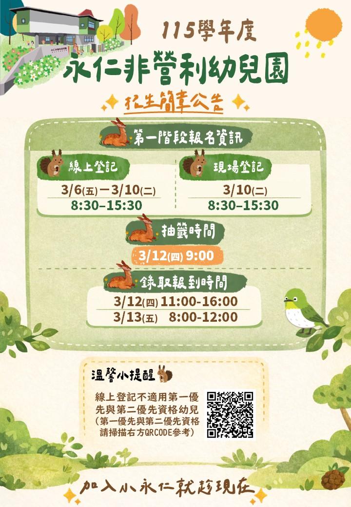 *115學年度非營利幼兒園招生登記每一幼兒以登記1園為限。