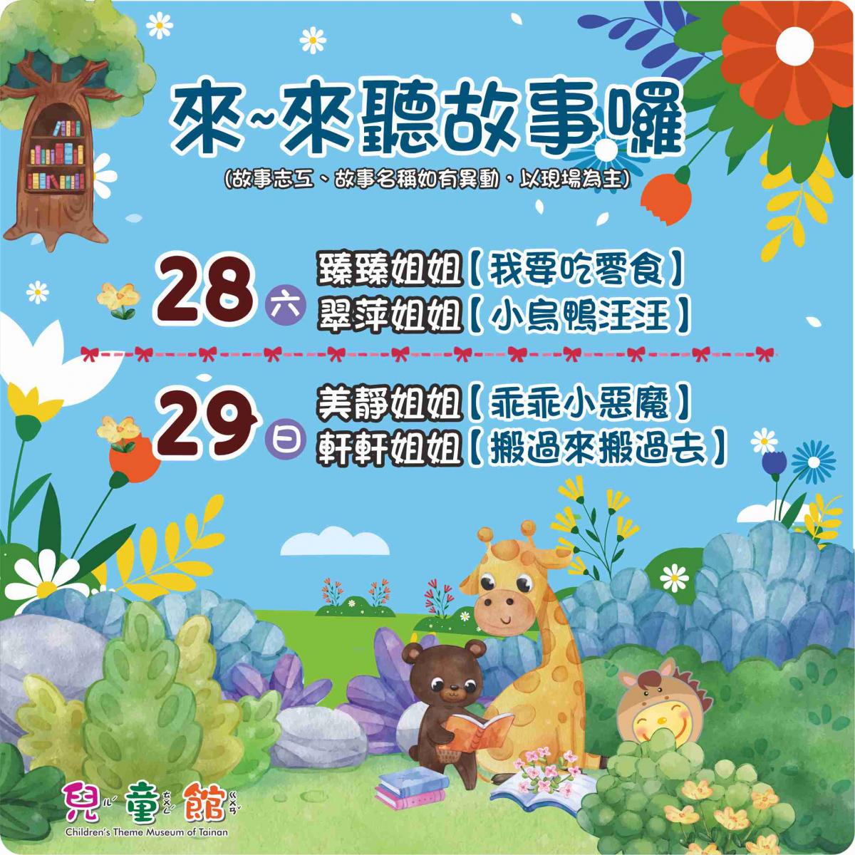 3/28(六)上午11:00,臻臻姐姐「我要吃零食」、下午2:00,翠萍姐姐「小烏鴨汪汪」。