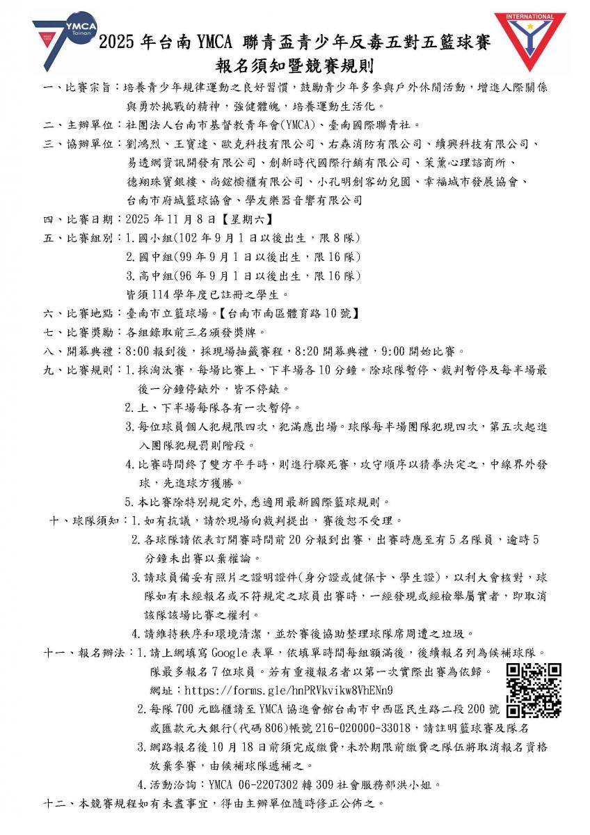 2025年台南YMCA 聯青盃青少年反毒五對五籃球賽--國小組額滿
