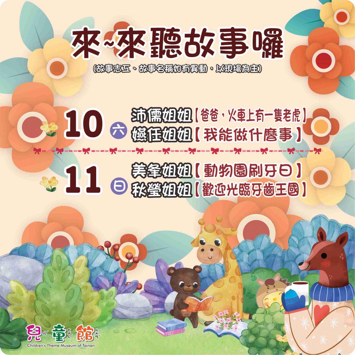 1/11(日)上午11:00,美夆姐姐「物園刷牙日」、下午2:00,秋瑩姐姐「歡迎光臨牙齒王國」。
