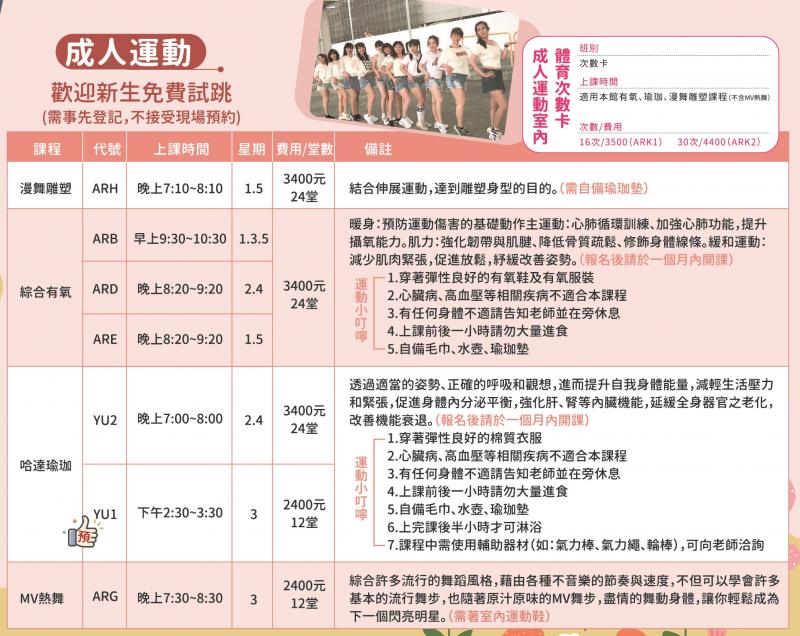 - 參加有氧試跳者,請著舒適易吸汗的運動服及上課專用運動鞋