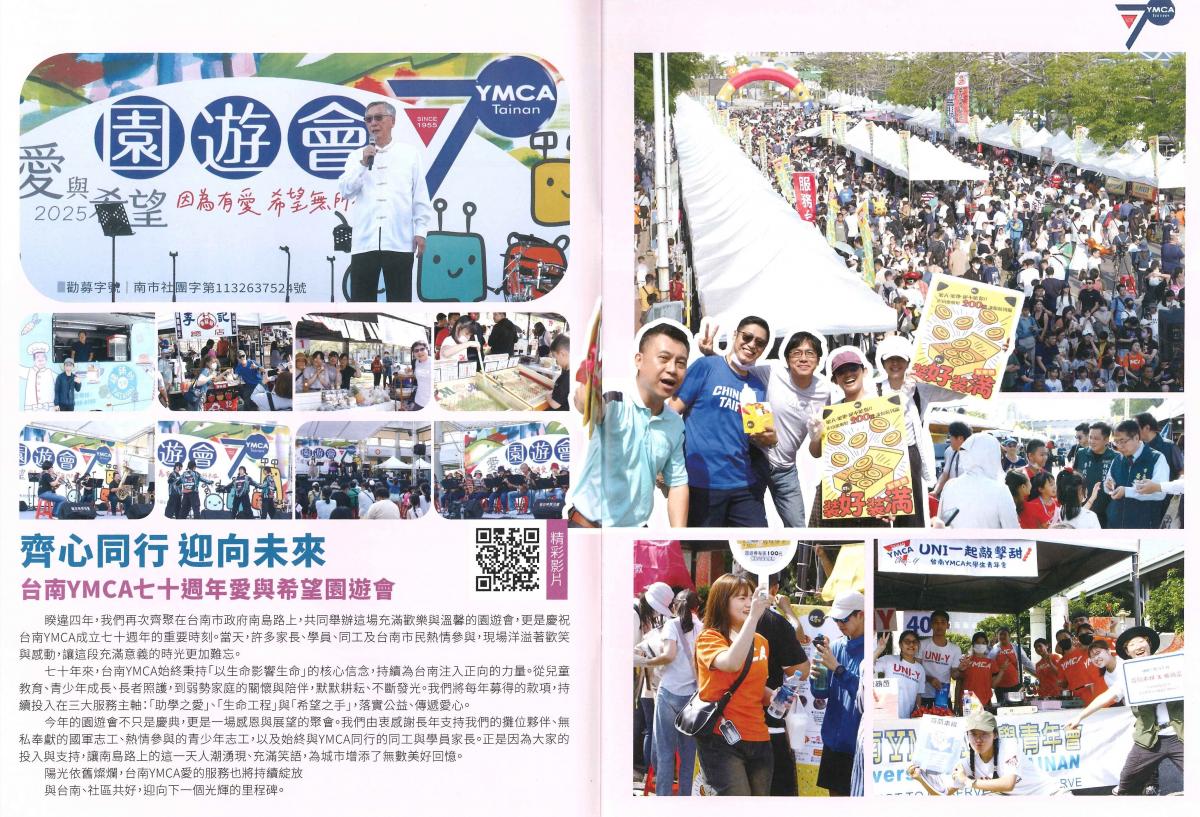 承蒙社會各界的協助與關心,許多志工朋友、民間企業和社福團體的參與和支持,本年度「愛與希望」募款園遊會於四月二十七日在南島路舉辦。適逢台南YMCA七十週年,來自各國友會許多朋友和會員參與。同時間五所幼兒園的親子運動會在市政府旁西側廣場活力十足熱情有勁,運動會後許多家長帶著小朋友享受週日午后美好親子時光。